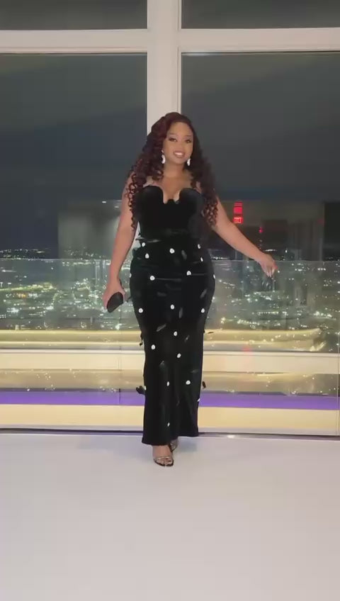 CHARMAINE: Is a beautiful long bodycon velvet dress with feathers all over the dress and silver rhinestones.