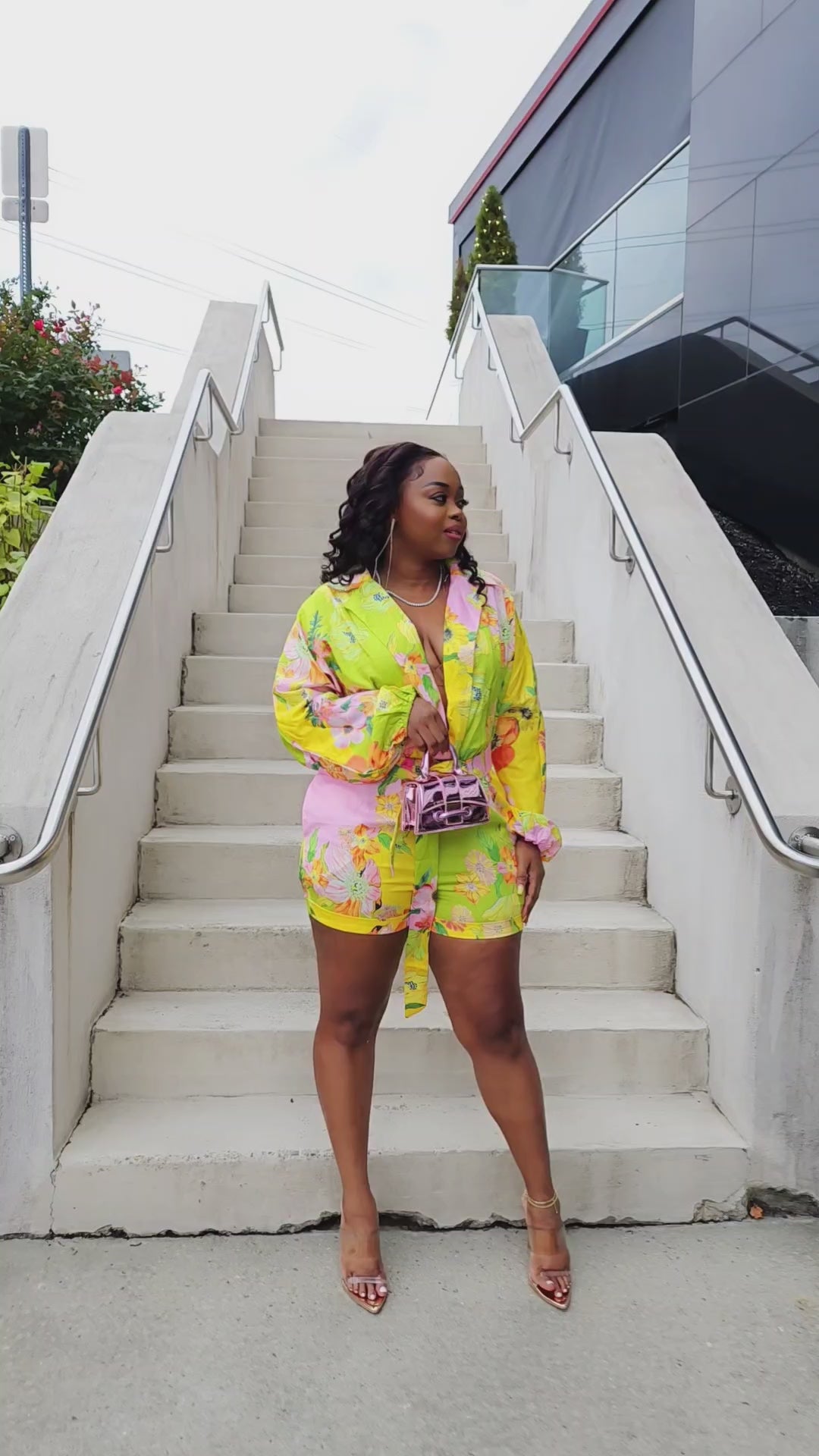 Dorce is a bright colorful long-sleeved romper with a deep v neckline. Perfect for any daytime occasion.