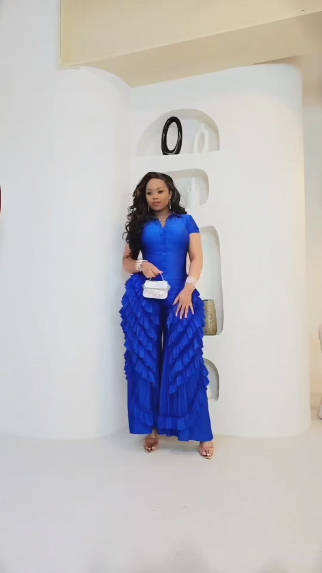Doris is a long royal blue short sleeve wide leg jumpsuit with buttons in the front. It is very stretchy, body hugging and not a see through. The ruffles that run along the bottom part of this jumpsuit are everything.
