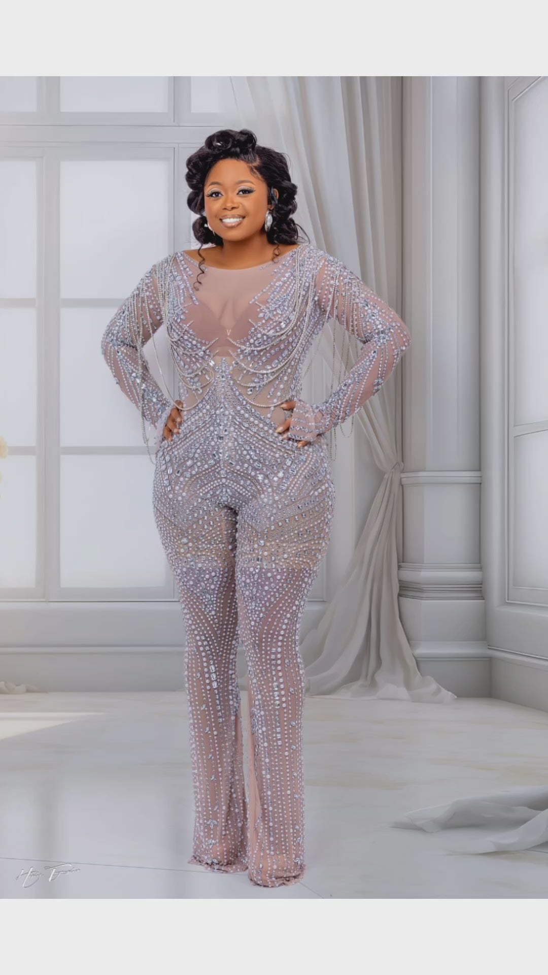 DYNAMITE: Is that jumpsuit that will make you feel an d look like a million dollar goddess. This stunning nude jumpsuit is embellished with heavy rhinestones, pearls and silver rhinestones hanging giving it that I AM THE MOMENT statement. Jumpsuit is long sleeved with the arms slitted towards the wrist area.