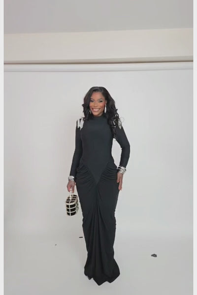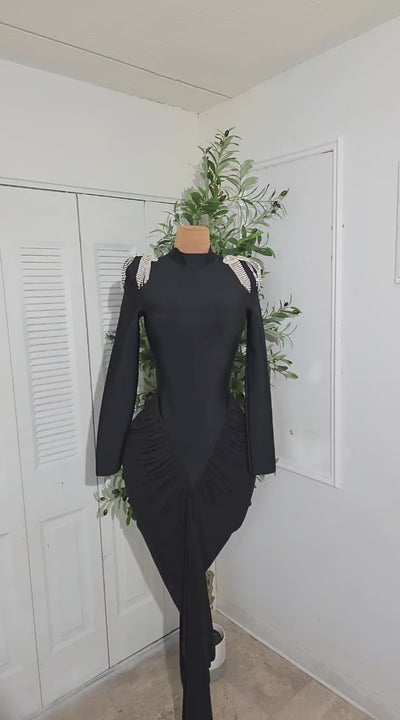 FARHA is a beautiful black dress with thevtop half bandage material and bottom is a double layered mesh fabric. Dress is long-sleeved with a turtle neck and zipper in the back
