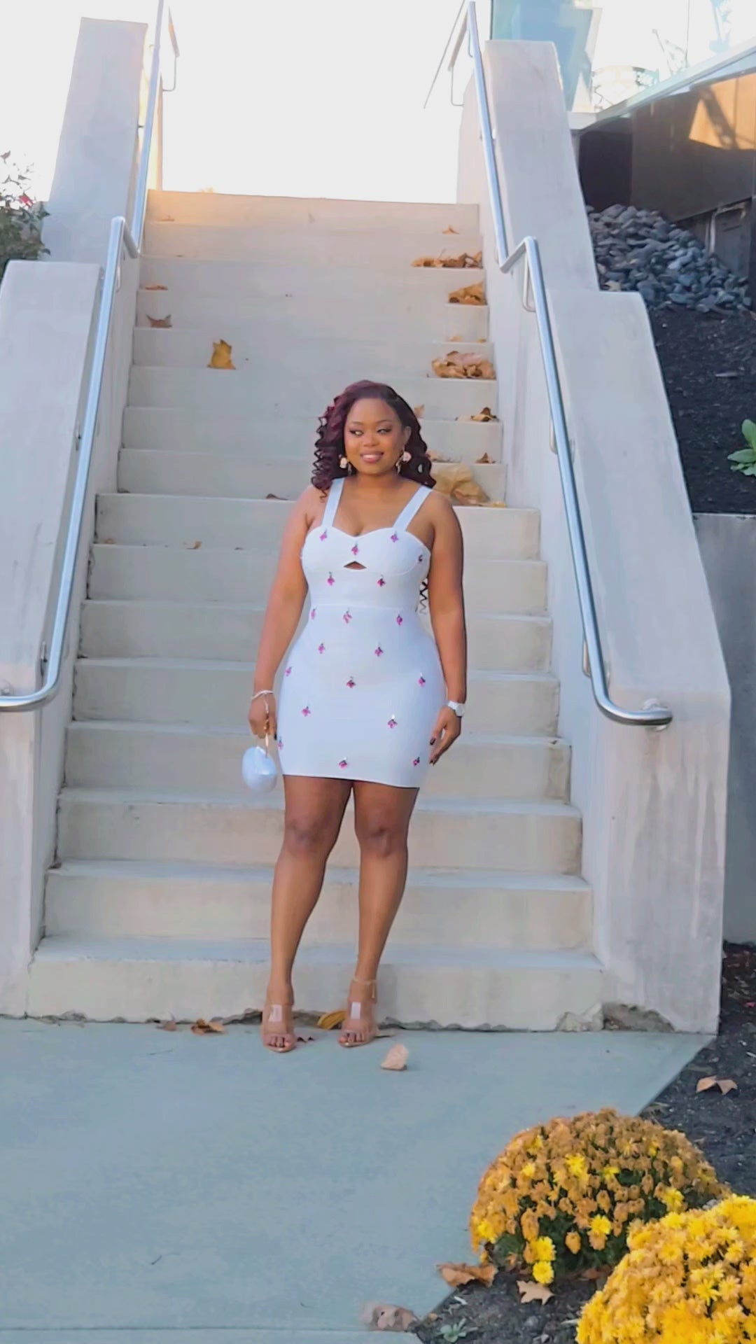 HAYA: Is a white bandage mini dress with pink rhinestones attached to the front if the dress. Dress has a keyhole. A perfect date night mini dress. Pair it with silver or fuchsia accessories and slay the night away.
