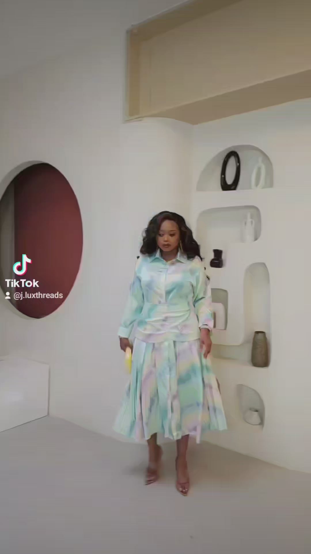 Olivia is a multi colored midi dress. Has buttons that run from top to bottom with pleats from waist to bottom. The dress is a free dress which makes it wide but with the peplum belt added with long sleeves, adds an elegant sophiscation to it.