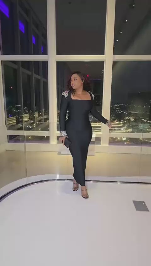 SHAE: A black long bandage bodycon dress with padded shoulder pads covered in beautiful colorful rhinestones also found at the arms. An elegant chic dress it is. Perfect for a special occasion.